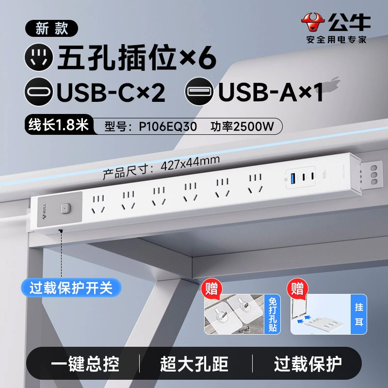 250V 10A输入,6位10A国标五孔+1位1U2C(30W快充),配置按钮开关,2米1平线+10A国标三脚插头(全长2米)