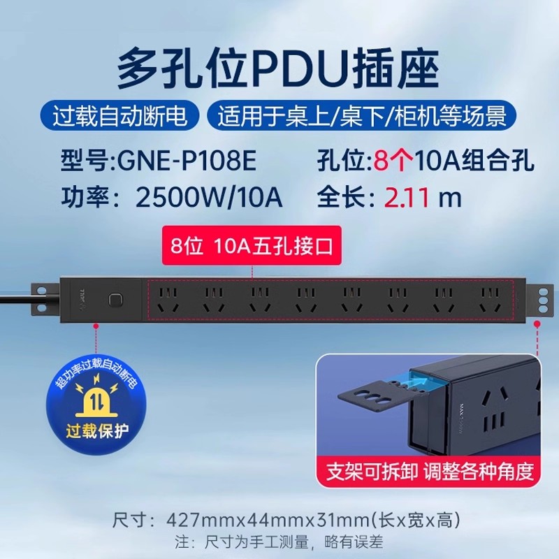 250V 10A输入,8位10A国标五孔,配置按钮开关+防过载,1.8米1平线+10A国标三脚插头(全长1.8米)