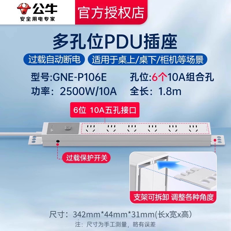 250V 10A输入,6位10A国标五孔,配置按钮开关+防过载,1.8米1平线+10A国标三脚插头(全长1.8米)