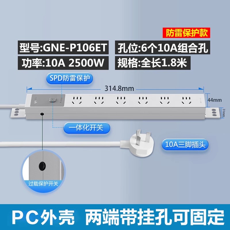 250V 10A输入,6位10A国标五孔,配置按钮开关+防雷+防过载,1.8米1平线+10A国标三脚插头(全长1.8米)