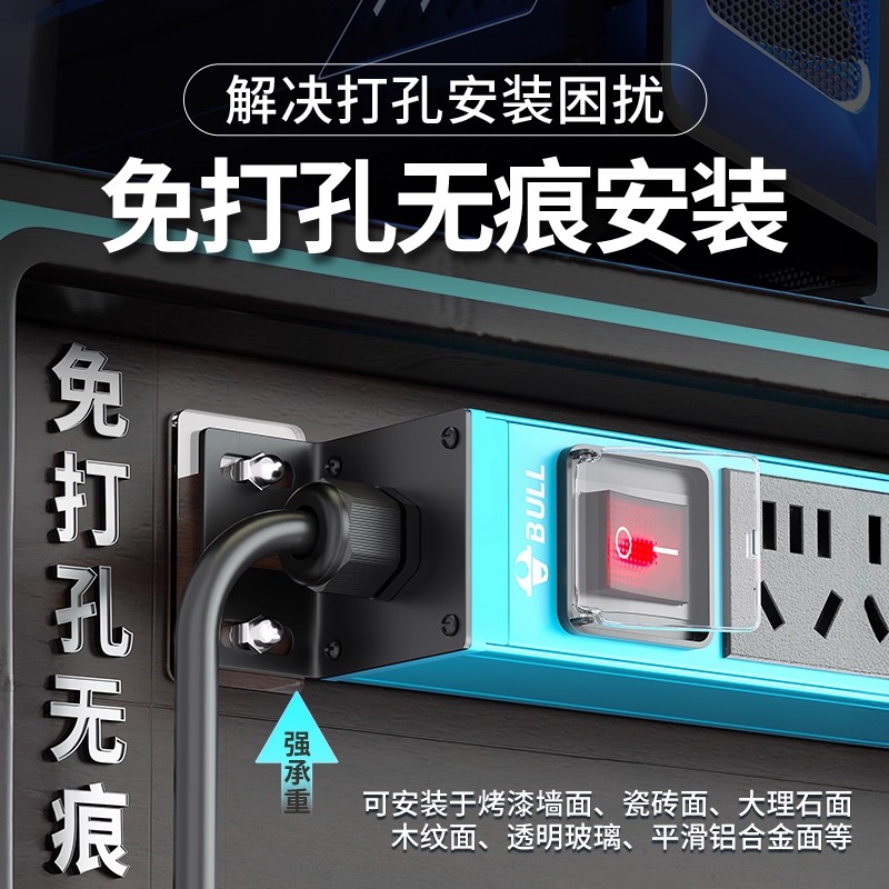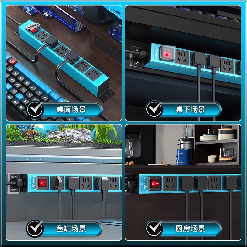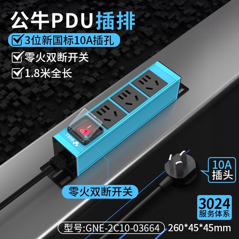 蓝色板体 1U非标尺寸 左侧进线:250V 10A输入,3位10A国标扁五孔+双断开关,1.8米1平线+10A国标三脚插头