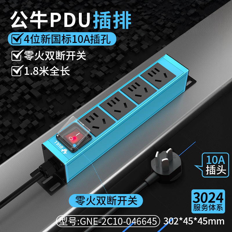 蓝色板体 1U非标尺寸 左侧进线:250V 10A输入,4位10A国标扁五孔+双断开关,1.8米1平线+10A国标三脚插头