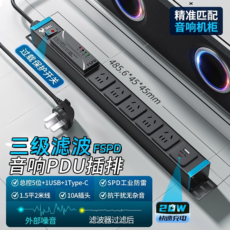 1U标准尺寸 右侧进线:250V 10A输入,5位10A国标五孔+1位1U1C输出,配置1位总控过载开关+F滤波模块,2米1.5平线+10A国标三脚插头