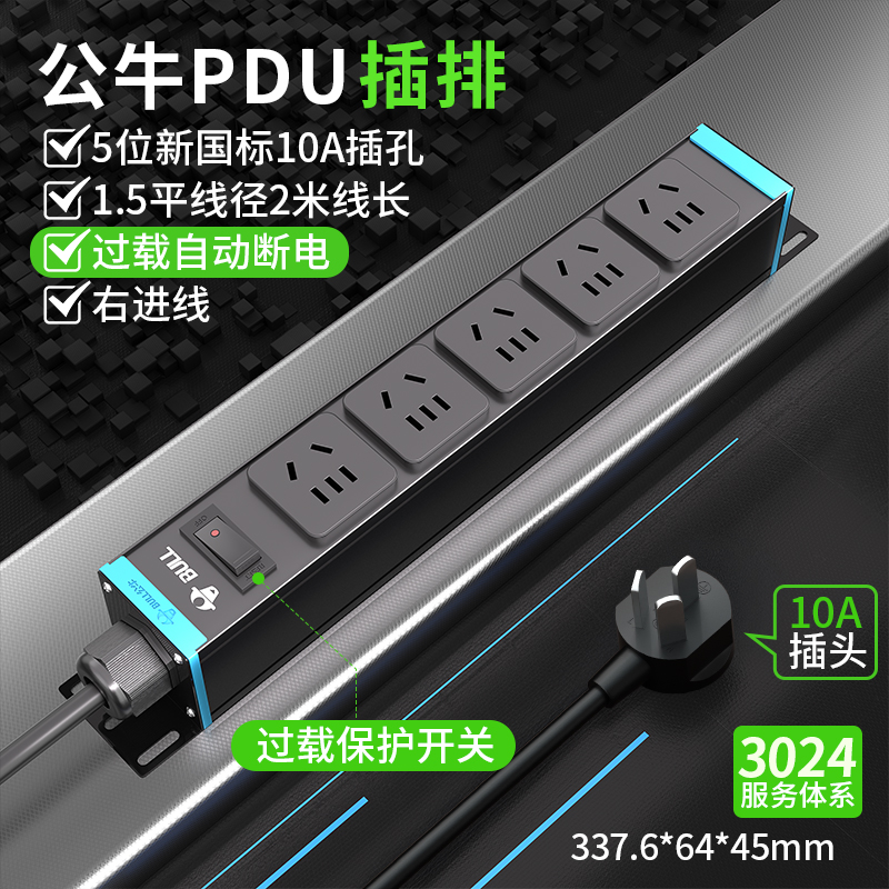 1U非标尺寸,蓝色封板,右进线 ,250V 10A输入,5位10A国标五孔输出,配置1位过载开关,2米1.5平线+10A国标三脚插头