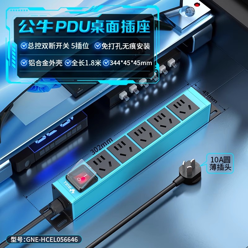 蓝色板体 1U非标尺寸 左侧进线:250V 10A输入,5位10A国标扁五孔+双断开关,1.8米1平线+10A国标三脚插头