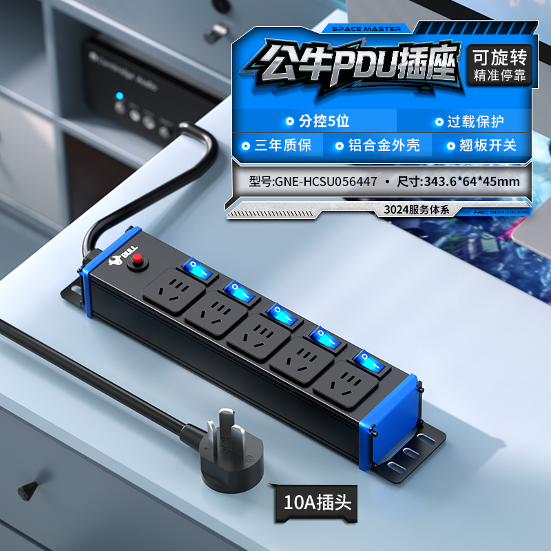 1.5U非标尺寸,蓝色封板,250V 10A输入,5位10A国标五孔输出,配置过载保护;5位蓝色翘板开关,2米1.5平线+10A国标三脚插头