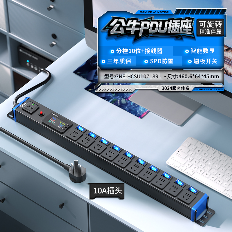 1.5U非标尺寸,蓝色封板,10位蓝色翘板开关,左侧进线:250V 10A输入,10位10A国标五扁孔,配置防雷模块+过载保护+计量D模块,1.5平2米线+国标10A薄插头