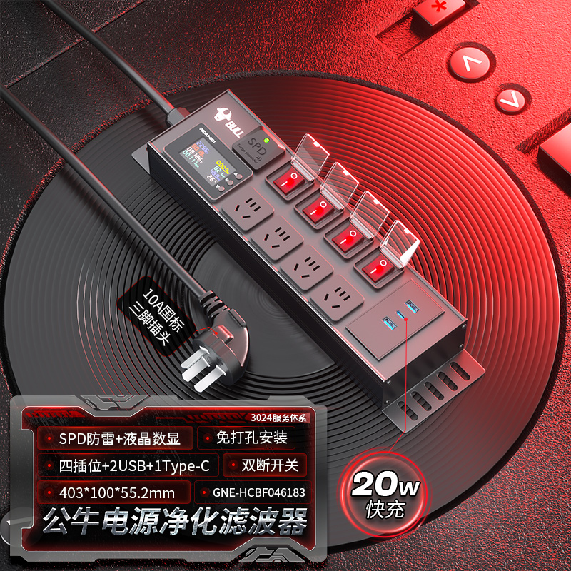 2.25U非标尺寸,红色开关(带盖),左侧进线:250V 10A输入,4位10A国标五孔输出,配置防雷+计量D模块+20W(2U1C);2米1.5平线+10A国标三脚插头