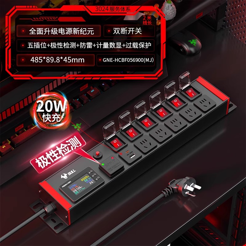 2U标准尺寸,红色封板红色开关(带盖),左侧进线:250V 10A输入,6位红色双断开关(带盖),5位10A国标五扁孔+1位1U1C充电模块+极性防雷SP模块+过载保护按钮+计量D模块+1.5平2米线;国标10A插头
